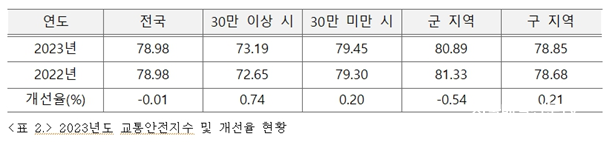 2023³â Àü±¹ ±³Åë¾ÈÀüÁö¼ö´Â 78.98Á¡À¸·Î 2022³â°ú À¯»çÇÑ ¼öÁØÀ̸ç, 30¸¸ ÀÌ»ó ½Ã¿Í 30¸¸ ¹Ì¸¸ ½Ã, ±¸ Áö¿ªÀº ±³Åë¾ÈÀü¼öÁØÀÌ Çâ»óµÈ °ÍÀ¸·Î ³ªÅ¸³µ´Ù.